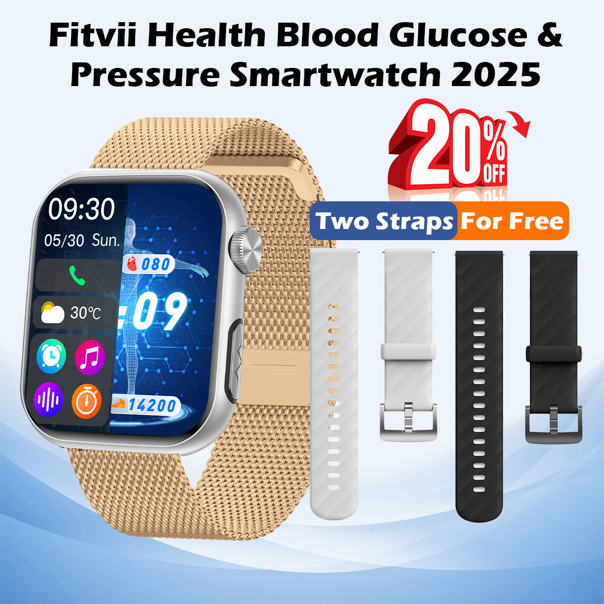 Upgrade Newest FITVII Health and FitnessTracker 2025 innovates new functions such as non-invasive blood glucose dial, blood pressure, Sleep, blood oxygen, heart rate, EKG, body composition, blood composition, women's health stress test, voice assistant, Ali payment, computer, etc. The bottom of the watch uses medical stainless steel material to prevent wrist allergies. It is a secondary medical device.